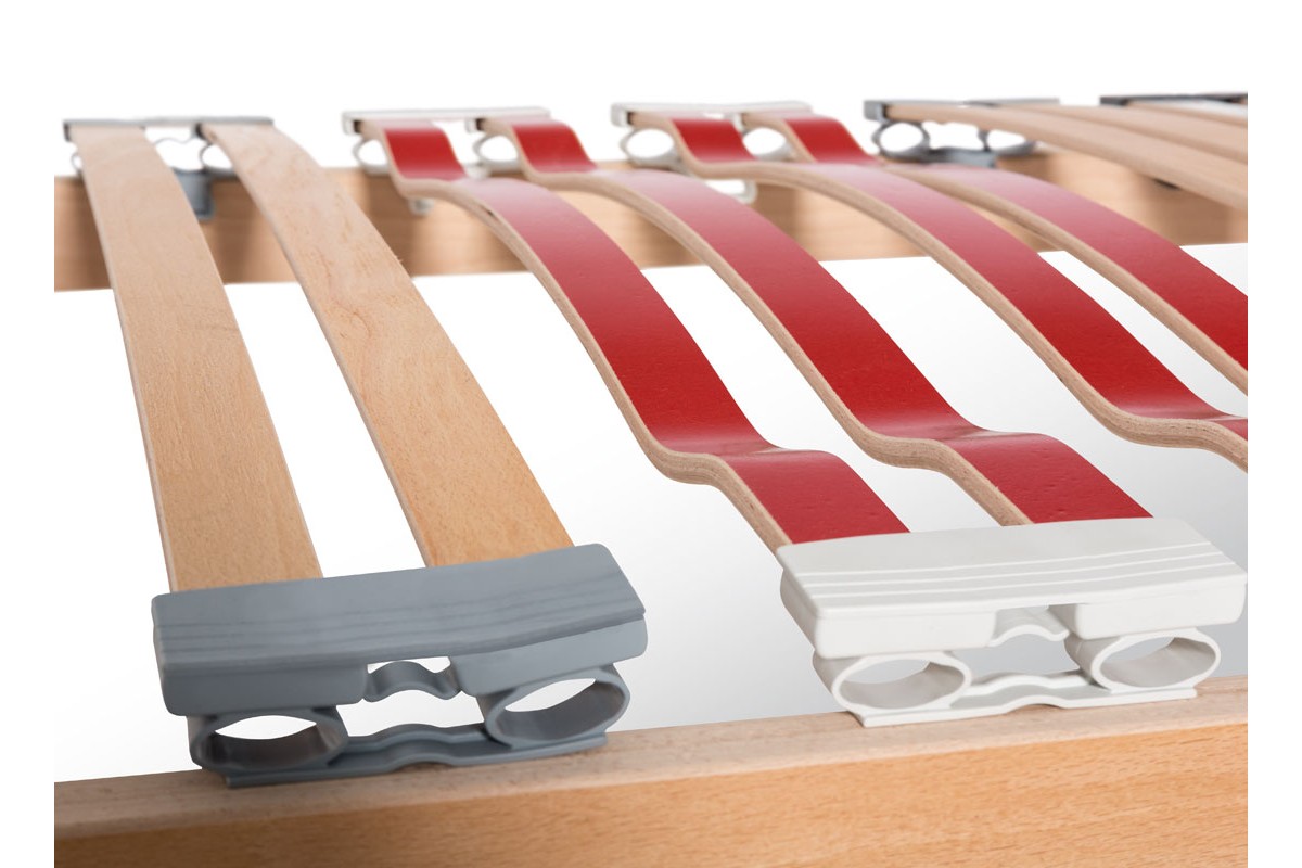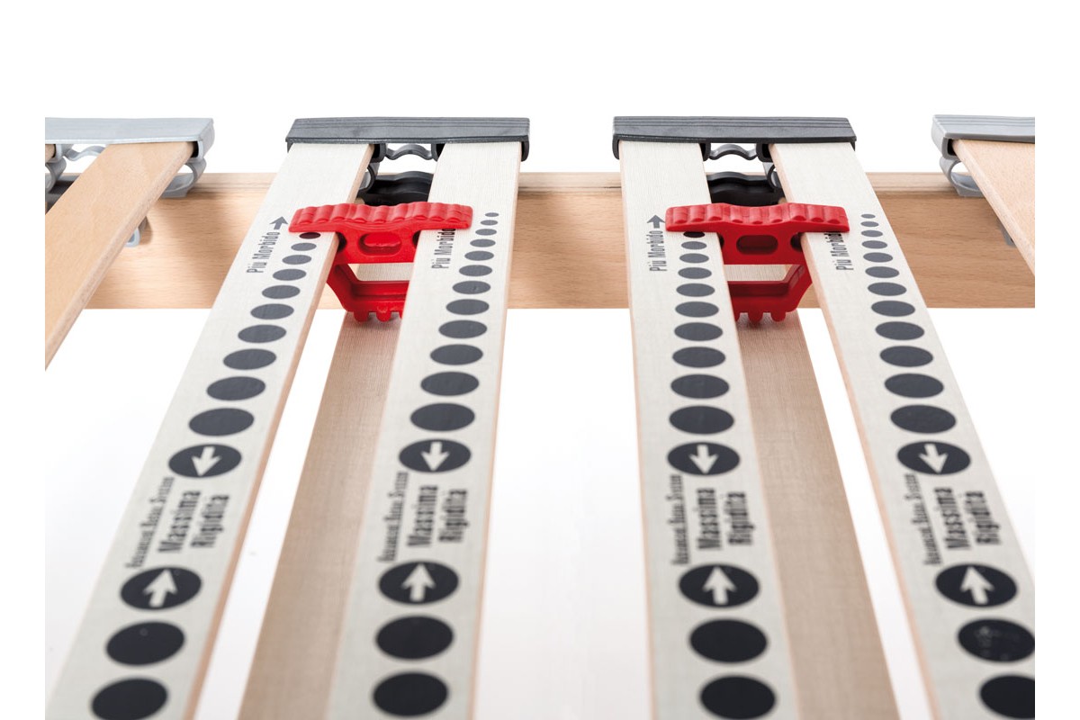 I raccordi ammortizzanti in SEBS, dalle proprietà elastiche anti-cigolio, uniscono le doghe a due a due e sono posizionati al di sopra del telaio per dare un miglior sostegno al materasso che poggia così uniformemente su tutto il piano di riposo.